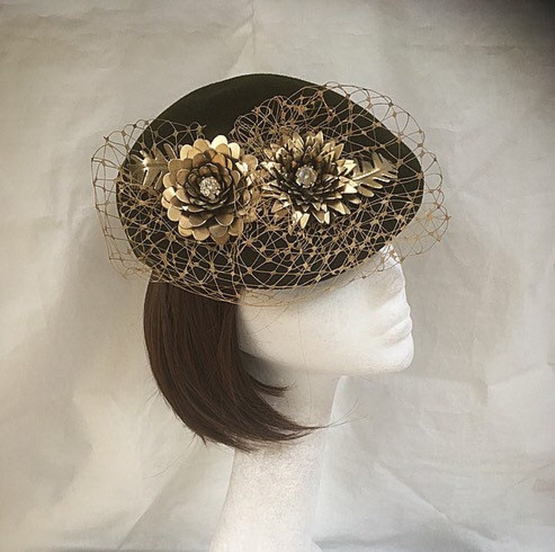 Dark Green Fascinator Royal Wedding Hat Gold Headdress Flower Hat Flower Corsage 1940s Hat Wedding Hat Green Vintage Cap