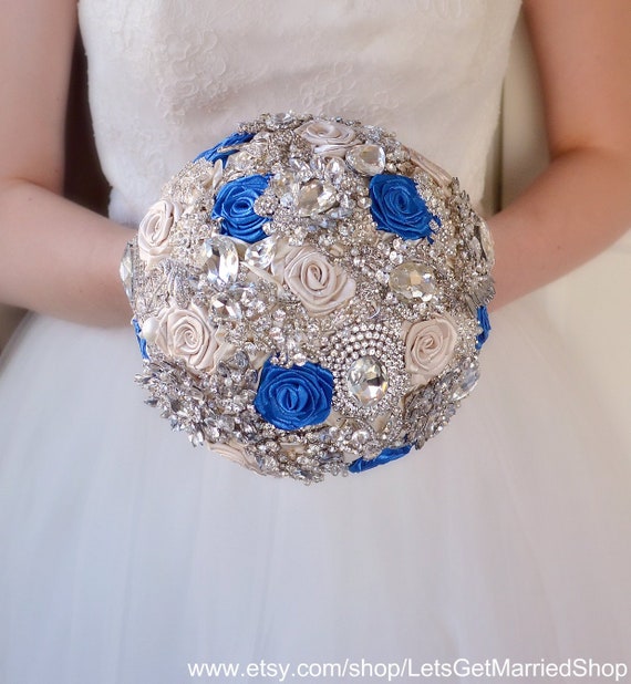 Wedding Royal Blue Brooch Bouquet Silver Beige Silk Fabric Roses Wedding Bridal Bouquet Crystal Alternative Chic Bride Broach Bouquet