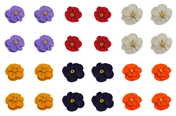 24 1 Royal Icing Pansy Cake Topper Cupcakes Weddings Sugar Flower Blossoms Pansies Red Orange Purple Lavender White Yello