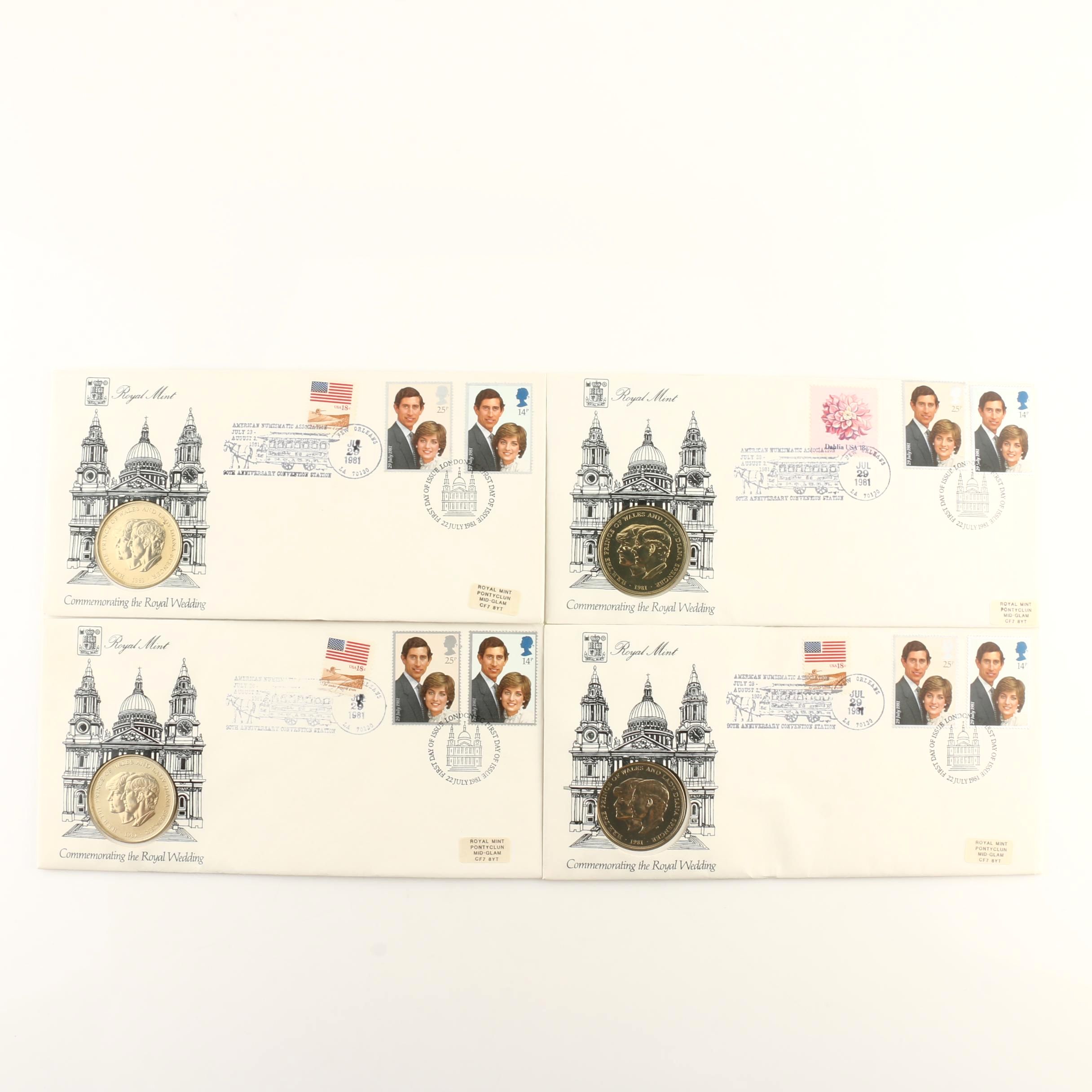 Presentation is approximately 8 4 12. A group of four 1981 one crown lady diana and prince charles royal wedding commemorative coin and first day cover sets.