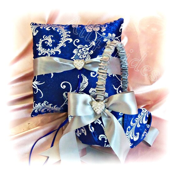 Royal Blue And Silver Grey Wedding Ring Pillow And Basket Weddings Ring Cushion And Flower Girl Basket Ceremony Accessories