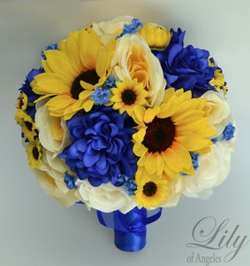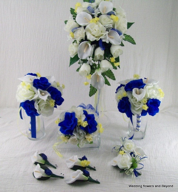 Details About 17 Piece Package Silk Flower Wedding Bridal Bouquet Royal Dark Blue Yellow Ivory