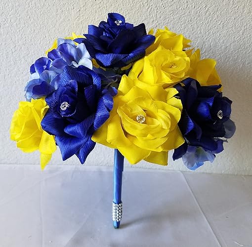 Yellow Royal Blue Silk Rose Flowers Wedding Bouquet With Rhinestones