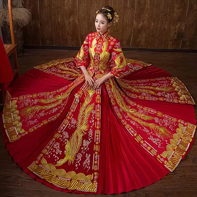 Luxury Ancient Royal Red Bride Dress Embroidery Phoenix