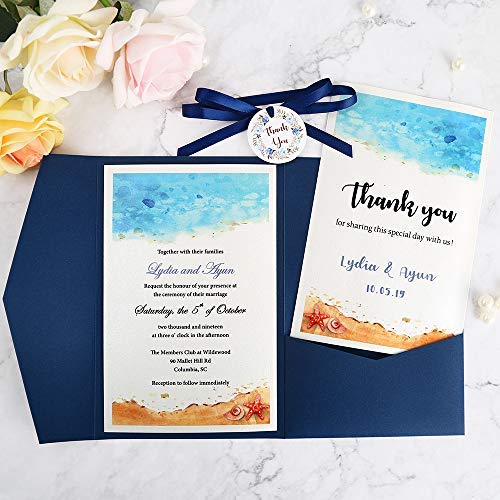 Doris Home 50 Pcs Tri Fold Wedding Invitations For Bridal Shower Dinner Beach Theme Party With Ribbon And Tags Blue 50pcs Customized Printed