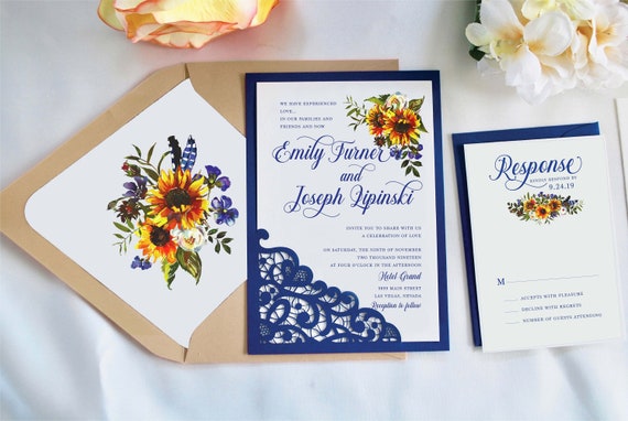 Royal Blue Sunflower Wedding Invitation Laser Cut Invitation Yellow Blue Wedding Invitation Sunflower Wedding Invitation Burgundy Invite