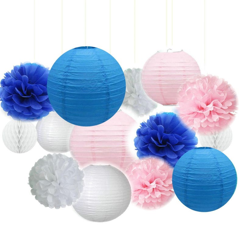 Set Of 14 Mixed Royal Blue Pink White Party Tissue Pom Poms Paper Lantern Honeycomb Ball Wedding Birthday Baby Shower Decoration
